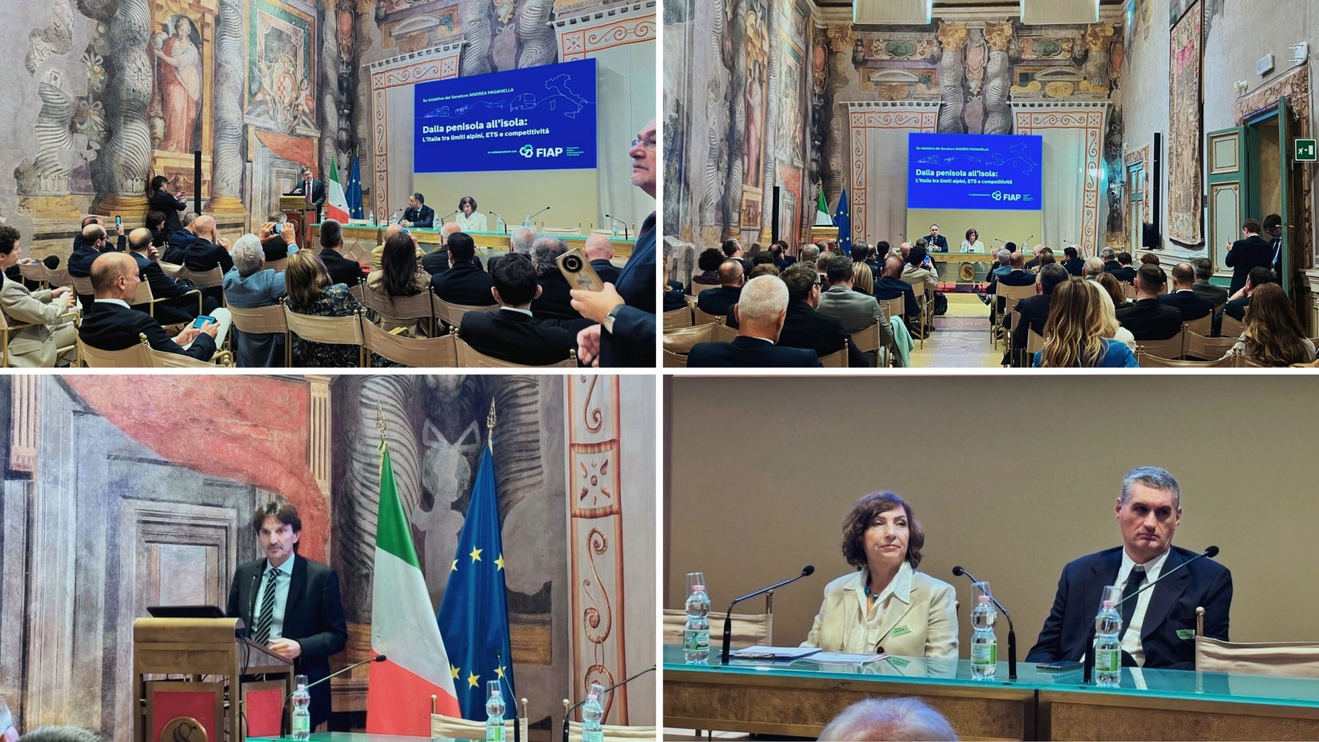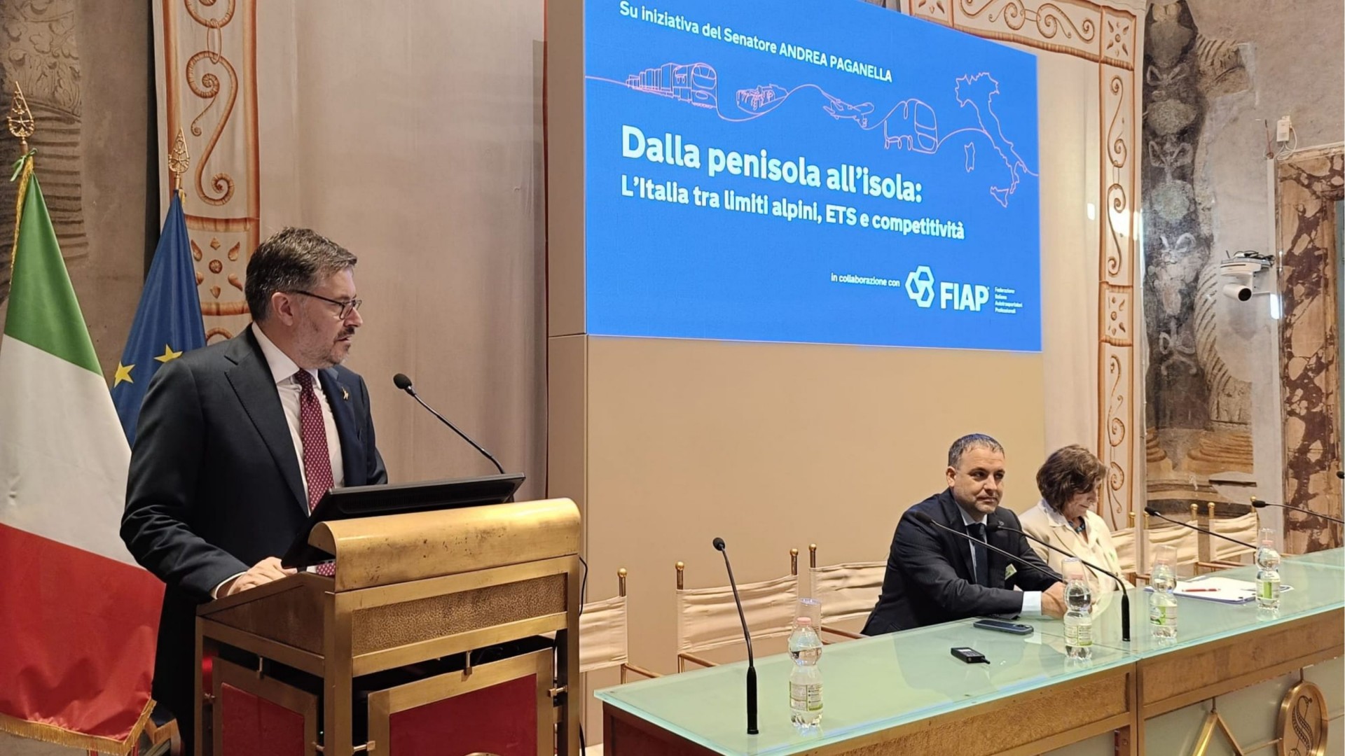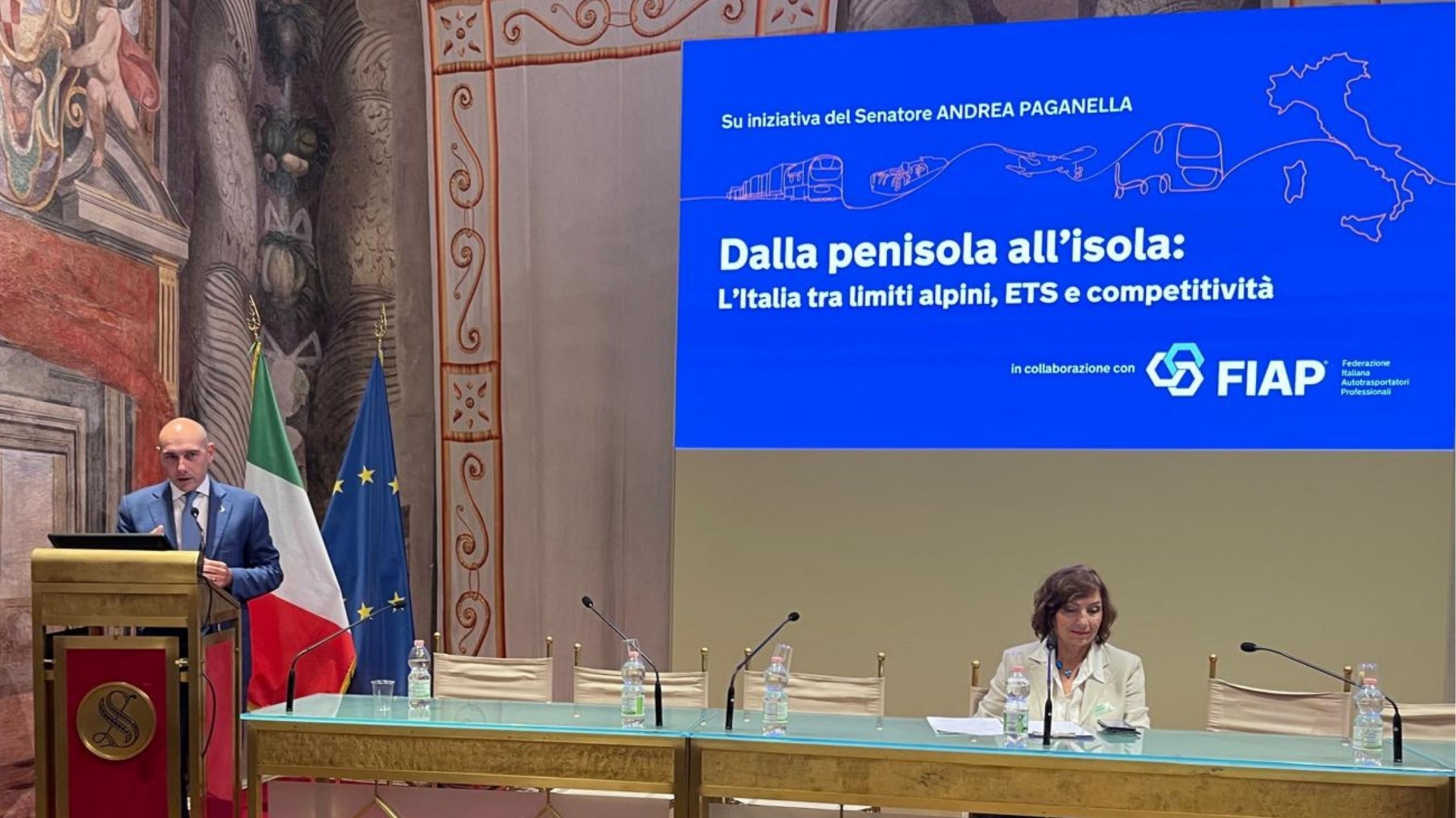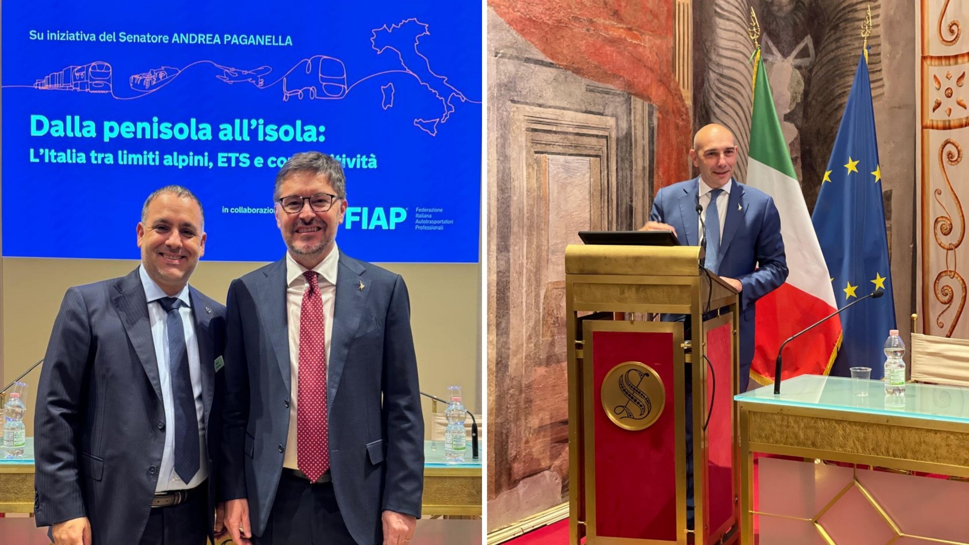 Roma, 9 ottobre 2025 – Si è svolto oggi, presso la Sala Zuccari di Palazzo Giustiniani, il convegno “Dalla penisola all’isola: l’Italia tra limiti alpini, ETS e competitività”, promosso dal Senatore Andrea Paganella in collaborazione con FIAP – Federazione Italiana Autotrasportatori Professionali, per affrontare due questioni oggi decisive per l’economia nazionale: la permeabilità del sistema alpino e l’impatto del sistema ETS sulle rotte marittime e logistiche.