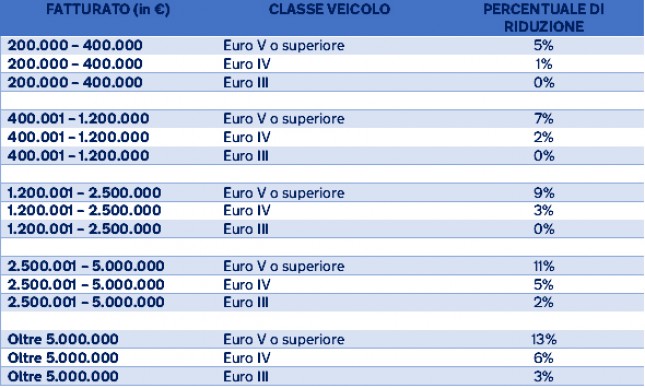 Di conseguenza, per i pedaggi 2020 il beneficio sarà riconosciuto ai veicoli euro 3 e superiori, individuati nella classe B, 3, 4 e 5 del sistema di classificazione assi sagoma (o in quelle 2, 3 e 4 del sistema volumetrico in uso in alcuni tratti autostradali, come ad es. la Pedemontana), secondo gli scaglioni di fatturato e le percentuali indicate nella seguente tabella:
