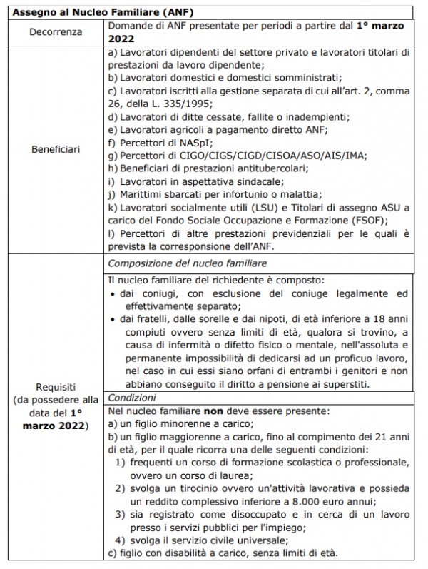 - continueranno ad essere riconosciute le prestazioni di Assegno per il nucleo familiare (ANF) e di Assegni familiari (AF) riferite a nuclei familiari composti unicamente dai coniugi (con esclusione del coniuge legalmente ed effettivamente separato), dai fratelli, dalle sorelle e dai nipoti, di età inferiore a diciotto anni compiuti ovvero senza limiti di età se, a causa di infermità o difetto fisico o mentale, siano nell’assoluta e permanente impossibilità di dedicarsi ad un proficuo lavoro, nel caso in cui essi siano orfani di entrambi i genitori e non abbiano conseguito il diritto a pensione ai superstiti.